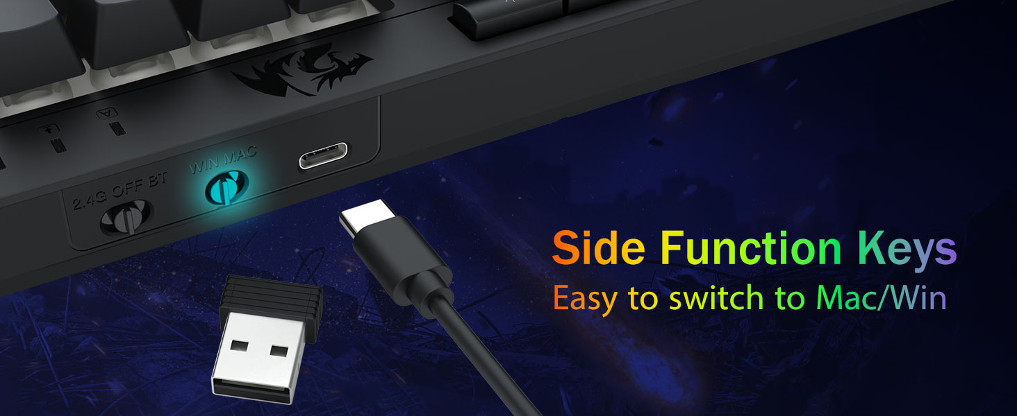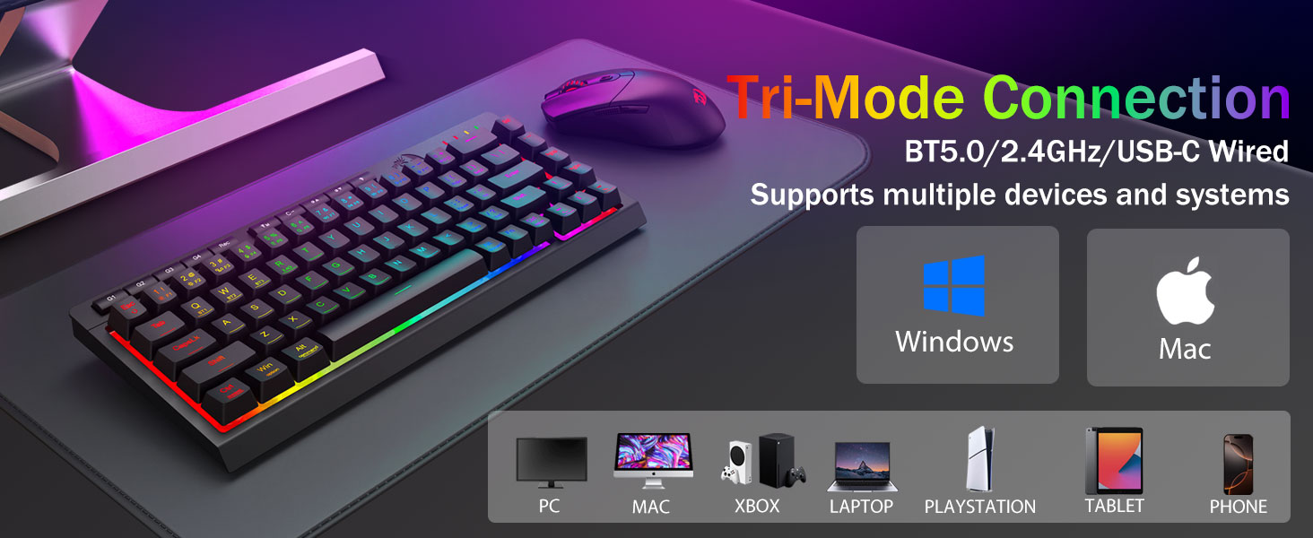 Tri-Aratau Whakamatau me te Matauranga Pūrere -Ka huri te huri i waenga i te Nihokikorangi 5.0, 2.4GHz ahokore, ko nga tikanga o te USB-C ranei, te hono atu ki nga taputapu 5 (PC, Mac, Papa, PS / Xbox). Pūrere Togglerfectly Pūrere ma te mauī ki te taha poto, te paatene taha-tino pai mo te mahi ranu / nga huinga petipeti. Noho pumau mo nga wiki me te pākahiko 4,000mah (30+ ra te ra, 50hrs RGB Runtime).