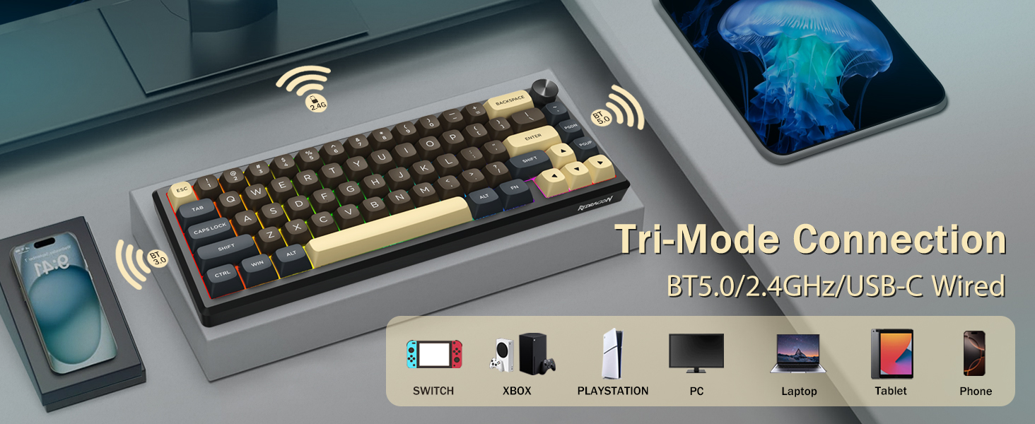 A: Ae, ko te K727 pango 60% Ahokore Mechanical Gaming Keyboard e tautoko ana i nga hononga ahokore me te waea. Ka taea e nga kaiwhakamahi te huri i waenga i nga momo tikanga i runga i o raatau hiahia.