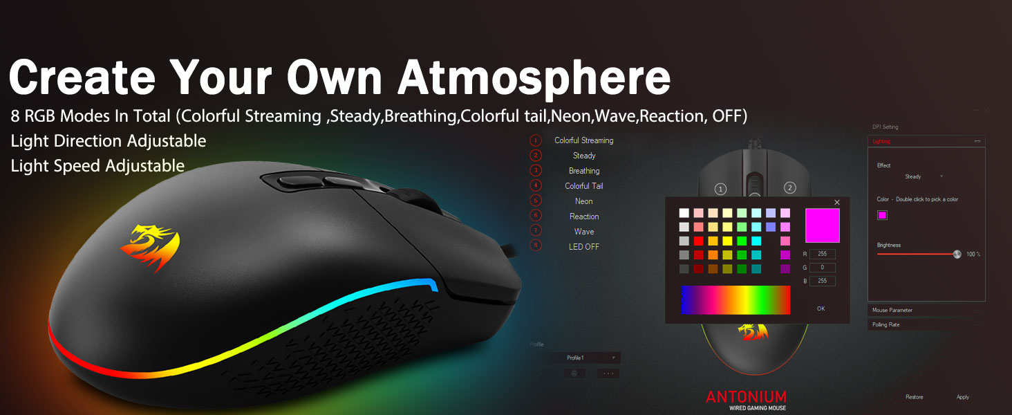 8 RGB backlit rgb tika- Tahuri te tuururu i runga i te patu i etahi patunga i to papa pakanga petipeti. Ko te huringa rgb kaha e kore e tuku i a koe i te wa e whakapaipai ana i to waahi petipeti, he pai ake me etahi atu o nga taputapu redragon me nga rama o runga.