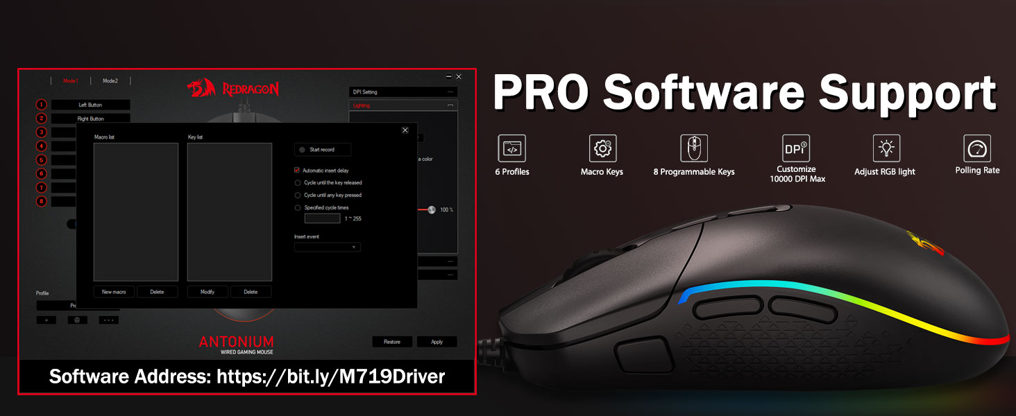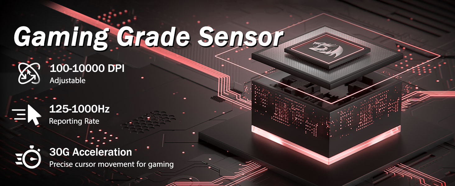 5 Taumata DPI ka taea me te 4 reiti pooti- Ko te kiore M719 e hangaia ana me nga taumata 5 DPI e waatea ana: DPI 400/800/1600/2400/4000. ngawari ki te whakawhiti i waenga i nga hiahia taakaro rereke. Ka taea te whakatikatika i te DPI i te ± 100 mai i te 100 ki te 10000 ma te raupaparorohiko hei whakatutuki i o hiahia katoa. 4 Ko te reiti pooti te whakatika: 125HZ / 255HZ / 2500HZ / 500HZ / 1000HZ / 1000HZ / 1000HZ / 1000HZ / Rōpū pooti teitei e whakarite ana i te nekehanga maeneene me te tere.