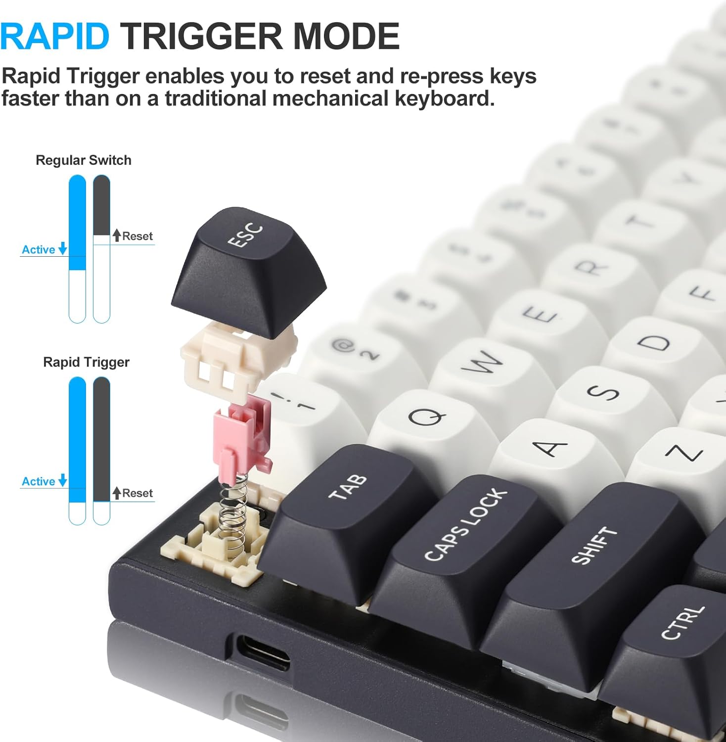 Ko te CHUANGQUAN White/Blue-Black K701 Rapid Trigger 60% Wired Magnetic Switch Mechanical Gaming Keyboard e tuku ana i te whakakorikori tere, te mana kiato, me nga patene maeneene, he mea hanga mo nga kaakaro e rapu tika ana, tere me te tatūnga ma.
