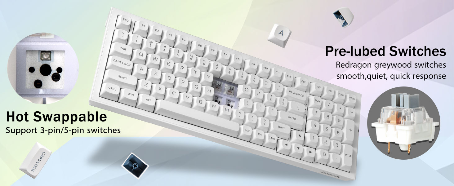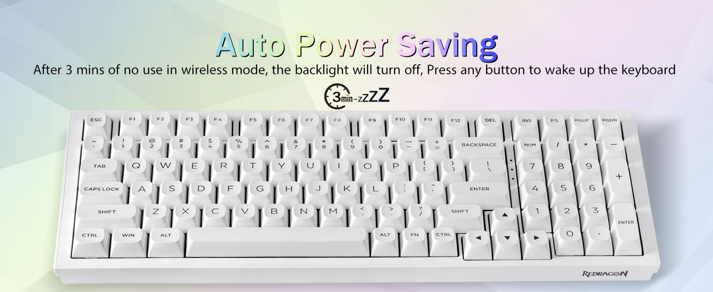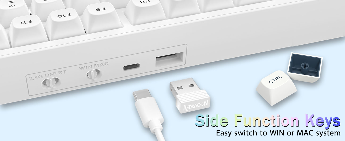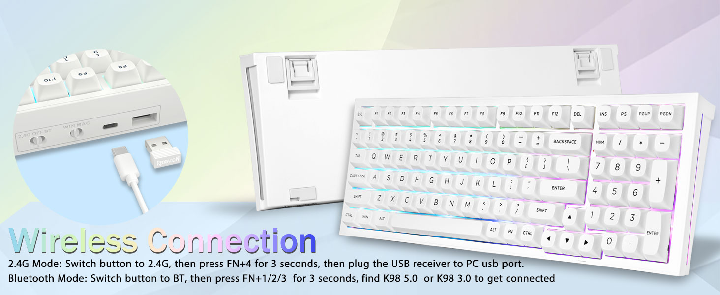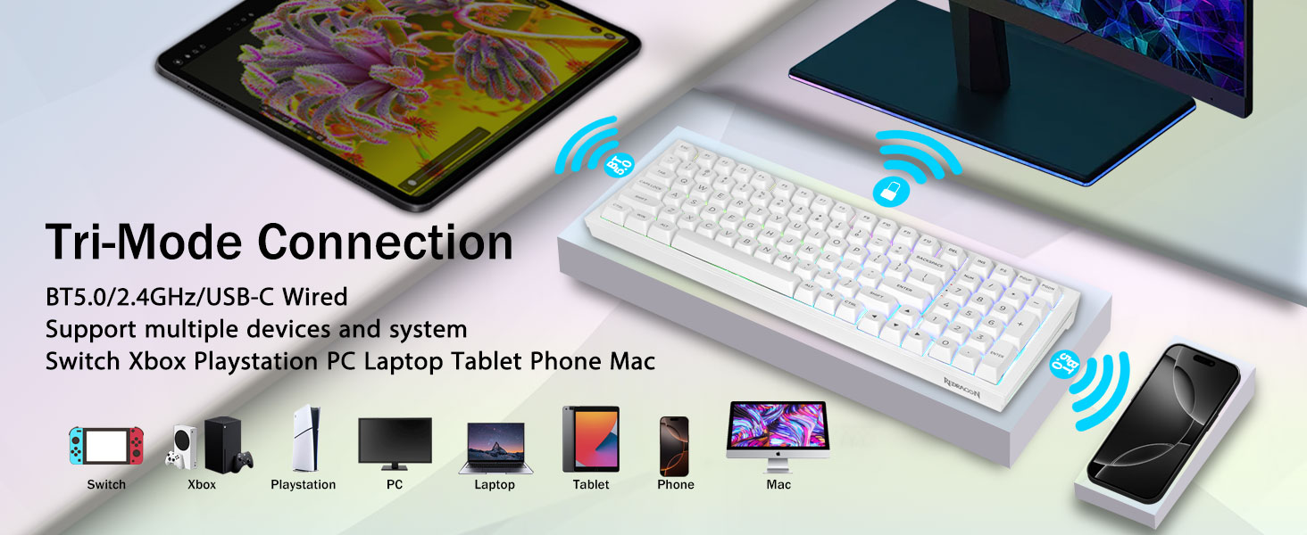 Papapātuhi ritenga-wera:Redragon K723 Ahorangi miihini ahokore e toru nga tikanga honohono, tae atu ki te BT5.0, 2.4ghz te aratau ahokore, me te aratau waea USB. Ka taea te hono atu ki te rima nga taputapu i te wa ano, ka huri haere i waenga i a raatau ma te FN me nga Kii nui. Kaore he rohe e pa ana ki to hononga papaputanga hei whakatutuki i nga hiahia o te mahi, petipeti, me te ako.